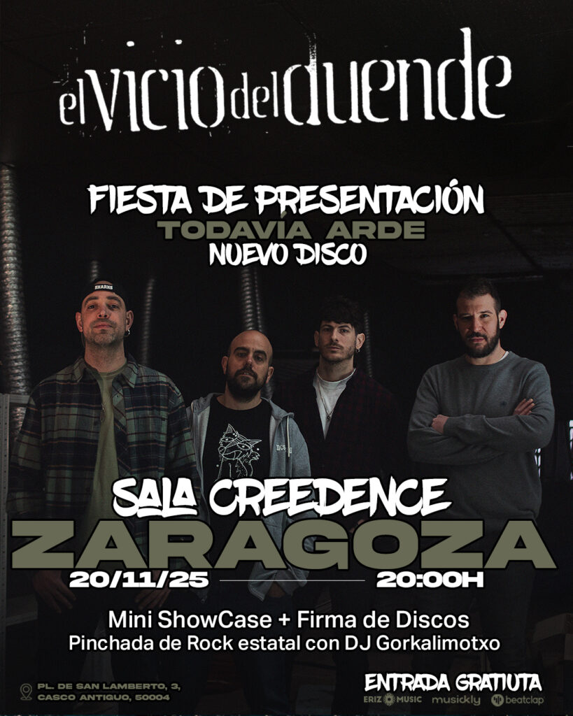 El Vicio del Duende, grupo de Rock zaragozano, publicará el 20 de noviembre su quinto disco de estudio, ‘Todavía arde’. Un trabajo compuesto por nueve canciones impregnadas del sonido urbano que les ha llevado a la escena del Rock nacional y a colaborar con referentes del género como Kutxi Romero (Marea), Rulo (Rulo y la contrabanda) o Xavier Moreno y Nando G. Miguel (La Fuga). La veterana banda abre así un nuevo camino en su larga trayectoria con muchas ganas de reencontrarse con sus seguidores en salas de varias ciudades de España.